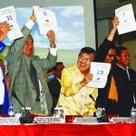 Semua ketua parpol peserta pemilu hadir dalam penetapan nomor urut parpol itu, termasuk Wakil Presiden Jusuf Kalla sebagai Ketua Umum Dewan Pimpinan Pusat (DPP) Partai Golkar.